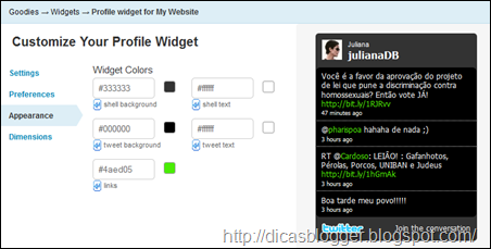 Twitter Badge – É um widget bem simples.Para adicioná-lo ao Blogger, configure o número de tweets, dê um nome ao widget (title) e clique no botão add to Blogger.