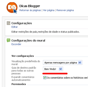 Após salvar, é necessário um último passo para que o visitante que ainda não tornou-se fã da página (ou que não esteja logado no Facebook) seja direcionado para a página de aterragem. Para isto, voltamos à Editar páginaConfiguração do Mural e escolhemos a página que configuramos previamente (Bem Vindo!):
