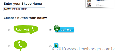 Para colocar um botão do Skype, clique aqui. Coloque seu nome de usuário em enter your skype name, escolha um dos botões disponíveis e copie o código fornecido, conforme consta nas imagens abaixo.