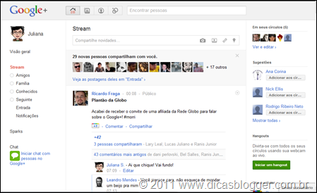 A empresa Google lançou nesta semana um novo serviço, o Google+. Trata-se de uma rede social, semelhante ao Facebook e ao Orkut, onde os usuários podem compartilhar informações, notícias, fotos e vídeos. Seguindo a tradição, por enquanto somente pessoas com convites estão testando o Google+ . Eu recebi o convite e vou compartilhar com vocês algumas imagens do Google+.