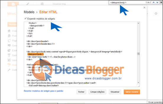 Em editar html, marque “expandir modelos de widgets” e procure (Crtl+F do teclado) por: <data:post.body/>